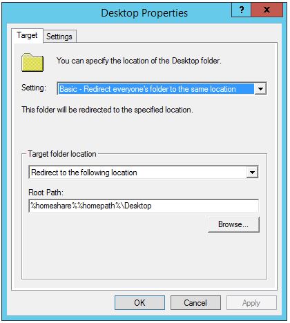 5.6 Im Dropdown-Menü Einstellungen wählen Sie „Standard – Leitet alle Ordner auf den gleichen Pfad um / Basic – Redirect everyone’s folder tot he same location“.