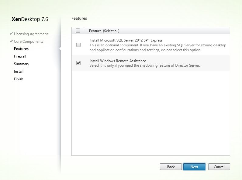 4. Wir werden eine externe Datenbank nutzen. Die Funktion „Install Windows Remote Assistance“ wird benötigt um die User Session zu spiegeln.