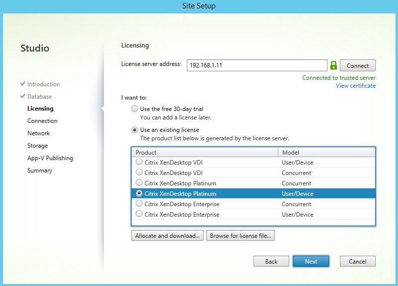 Hier geben wir die IP-Adresse der bereits installierten License Server ein. Ein FQDN kann ebenfalls verwendet werden.