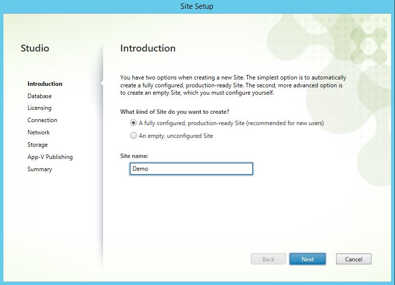 Die Option "A fully configured, production-ready Site" erlaubt uns granulare Konfiguration der Citrix Komponenten.