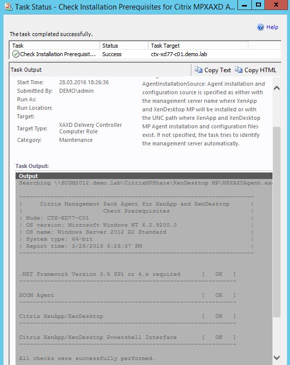 9.2 Im Bereich Tasks starten die Überprüfung von Voraussetzungen „Check Installation Prerequisites for Citrix MPXAXD Agent“