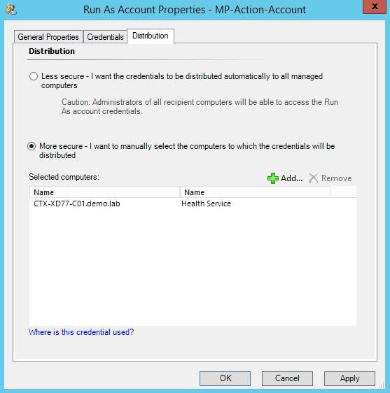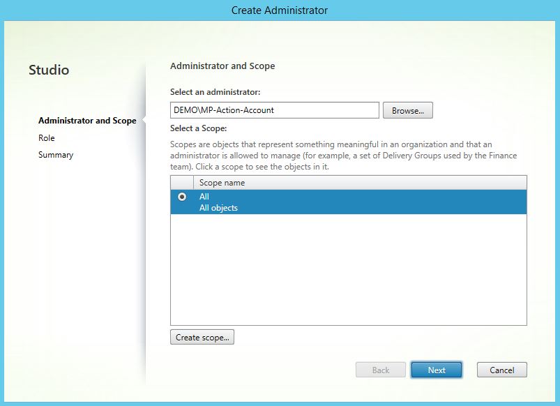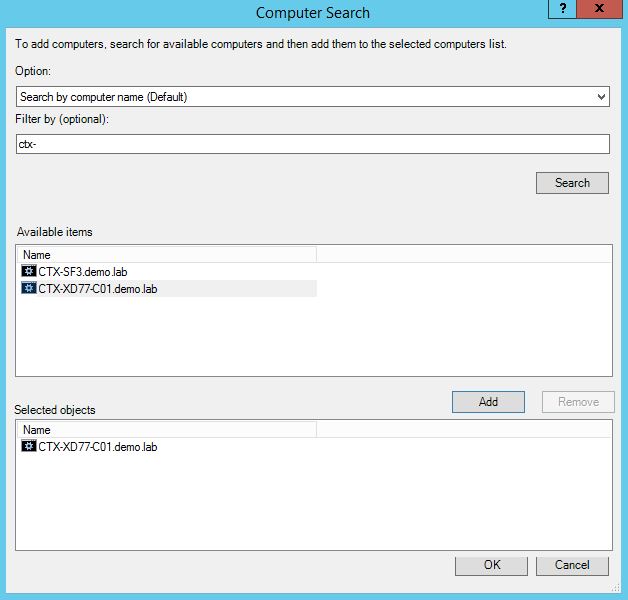 5.4. Im Dropdown-Menü wählen Sie den richtigen User und klicken Sie auf OK. Für eine Demo-Umgebung ist die Auswähl „All targeted objects“ vollkommen ausreichend. Für eine produktive Umgebung wäre es sinnvoll einen XenApp/XenDesktop Delivery Controller explizit auszuwählen.