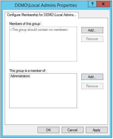 Im Bereich „This group is a member of:“ die Gruppe Administrators hinzufügen