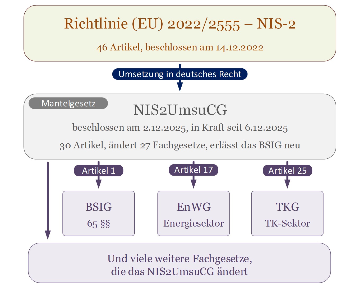 In Deutschland wurde die NIS-2-Richtlinie durch das NIS-2-Umsetzungsgesetz überführt (Gesetz zur Umsetzung der NIS-2-Richtlinie und zur Regelung wesentlicher Grundzüge des Informationssicherheitsmanagements in der Bundesverwaltung), kurz NIS2UmsuCG. Das NIS2UmsuCG besteht aus 30 Artikeln.  Das Gesetz wurde am 5. Dezember 2025 im Bundesgesetzblatt verkündet und ist seit dem 6. Dezember 2025 in Kraft. Durch das neue Gesetz sind in Deutschland etwa 30.000 Unternehmen betroffen.