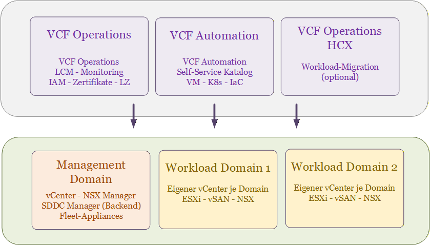 Wie bereits erwähnt, gab es in VCF 5.x für jeden Verwaltungsbereich ein eigenes Tool: SDDC Manager für Lifecycle-Aufgaben, Aria Operations für Monitoring, Aria Automation für Self-Service, Aria Suite Lifecycle für das Management der Aria-Komponenten selbst. Diese Tools waren miteinander integriert, aber nicht wirklich vereinheitlicht. Es gab keine einzige Oberfläche, von der aus alle Aufgaben erledigt werden konnten. Stattdessen musste man wissen, welches Tool für welche Aufgabe vorgesehen sind und sich dementsprechend zwischen den Konsolen bewegen.