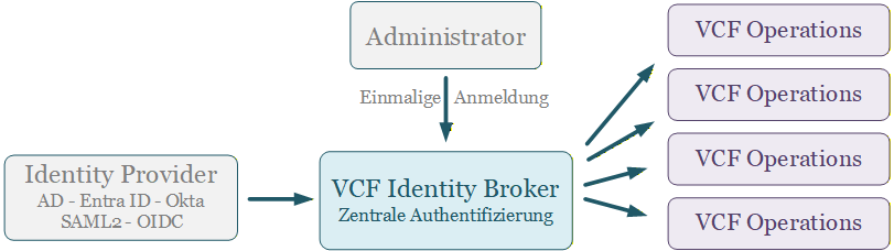VCF 9 löst dieses Problem mit dem VCF Identity Broker (VIDB). Der VIDB ist eine neue Komponente, die einmalig mit dem IdP des Unternehmens verbunden wird und danach als zentrale Authentifizierungsquelle für alle VCF-Komponenten dient. Er wird in VCF Operations konfiguriert und mit dem gewünschten Identity Provider verbunden. Unterstützt werden Active Directory, Entra ID, Okta, Ping und alle OIDC- oder SAML2-konformen Dienste. Im nächsten Schritt wird jede VCF-Komponente angewiesen, den VIDB als Authentifizierungsquelle zu nutzen. Danach gibt ein Administrator seine gewohnten Unternehmensanmeldedaten ein und erhält damit Zugang zu VCF Operations, vSphere Client, NSX Manager und VCF Automation, ohne sich bei jeder Komponente separat anmelden zu müssen.
