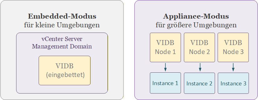 Der Embedded-Modus läuft innerhalb des Management-Domain-vCenter und benötigt keine zusätzlichen Ressourcen. Er eignet sich eher für kleinere Umgebungen mit einer einzigen VCF Instance.